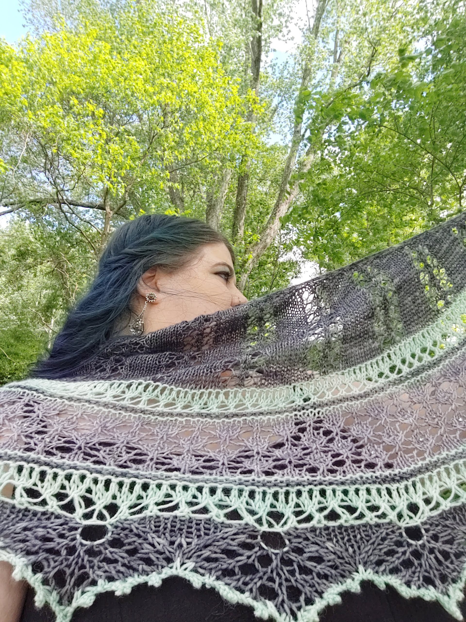 There were a LOT of 3 color shawls out there, but most of them were shapes I don't generally like to wear (sorry, asymmetrical triangle fans, but they're not for me) or didn't actually use all 3 colors for the lace parts.